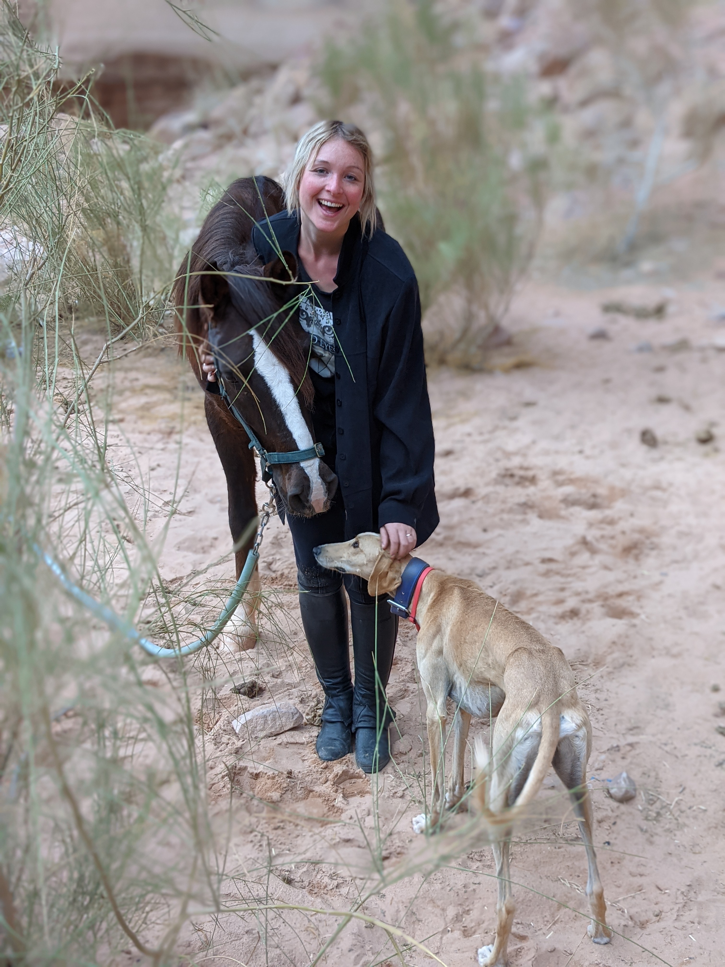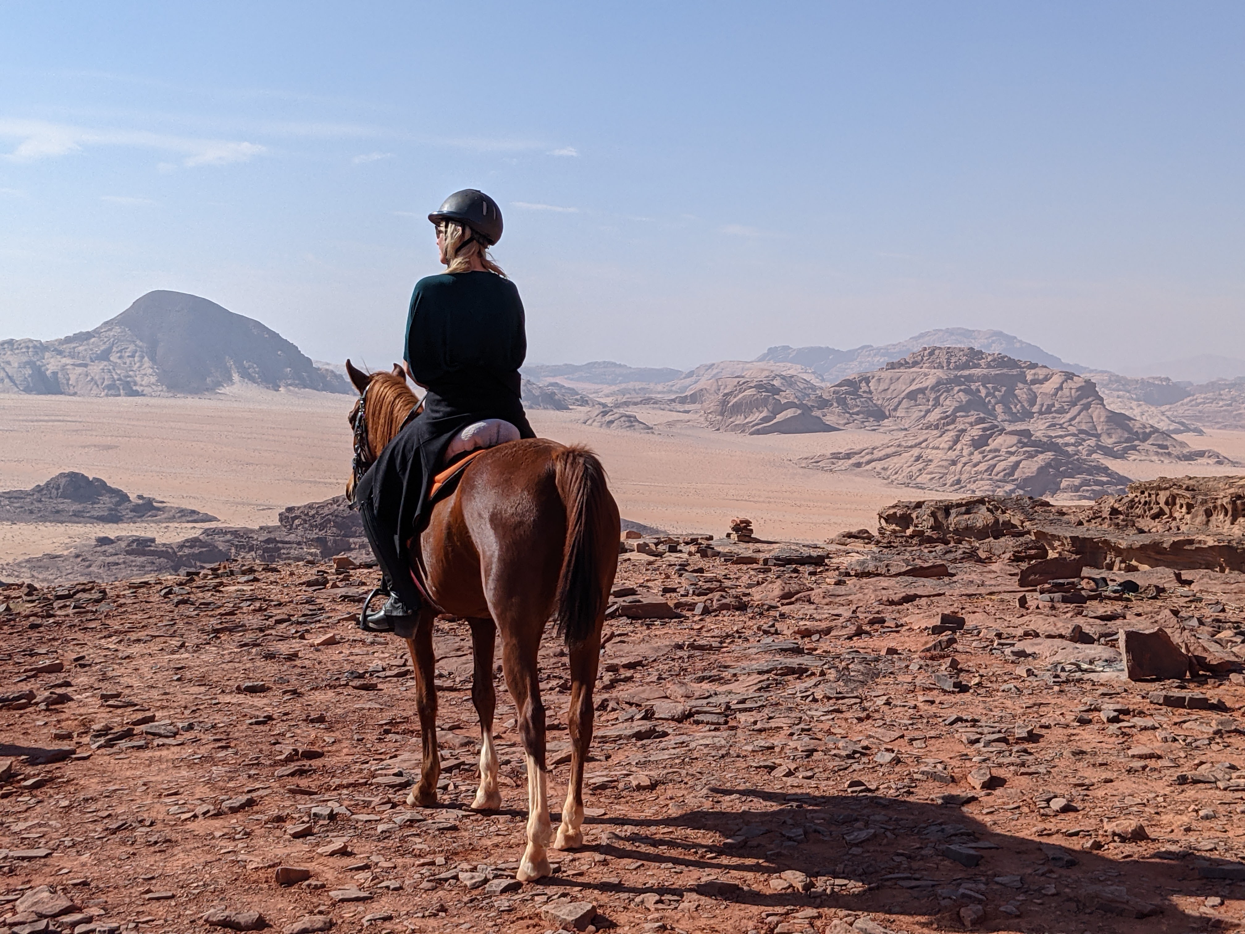 As Julie has lots of experience with horses, she toured on Knafeh, a sweet energetic chestnut mare. K-J got Kabir, a kind and steady older horse. Guide Ali went on fierce Najam.